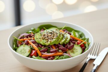 - Découper l’avocat, le concombre, la carotte et l’oignon rouge en fines tranches ou dés.