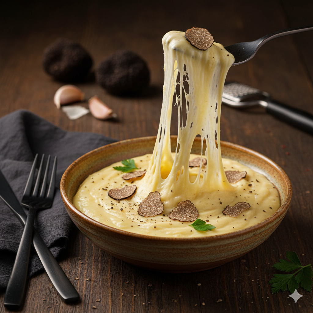 - Servez l’aligot aux truffes bien chaud, accompagné d’une viande grillée ou d’une volaille rôtie. Pour une présentation élégante, râpez un peu de truffe supplémentaire sur le dessus avant de servir.