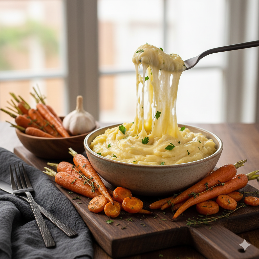 Aligot traditionnel avec des carottes rôties