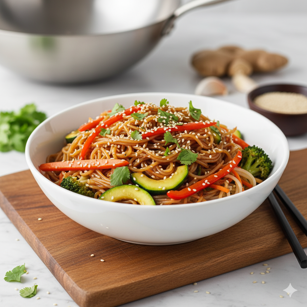 - Dans un wok ou une grande poêle, chauffez l’huile neutre à feu moyen-vif. Ajoutez l’ail et le gingembre, faites revenir 30 secondes jusqu’à ce qu’ils soient parfumés. Ajoutez les légumes (carotte, poivron, courgette, brocolis) et faites-les sauter pendant 5 à 7 minutes, en remuant régulièrement, jusqu’à ce qu’ils soient tendres mais encore croquants.