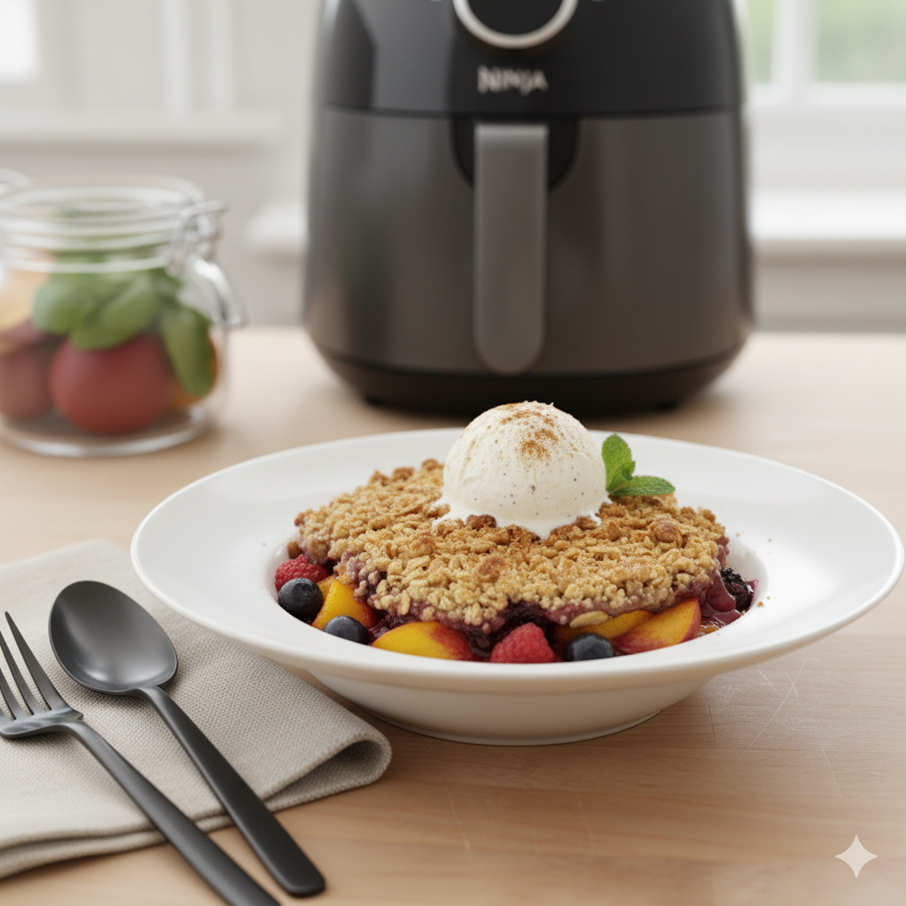 - Placez le plat dans l’air fryer Ninja. Réglez la température à 180°C et faites cuire pendant 15 minutes. Vérifiez la cuisson : le crumble doit être doré et croustillant. Si nécessaire, prolongez la cuisson de 2 à 3 minutes.