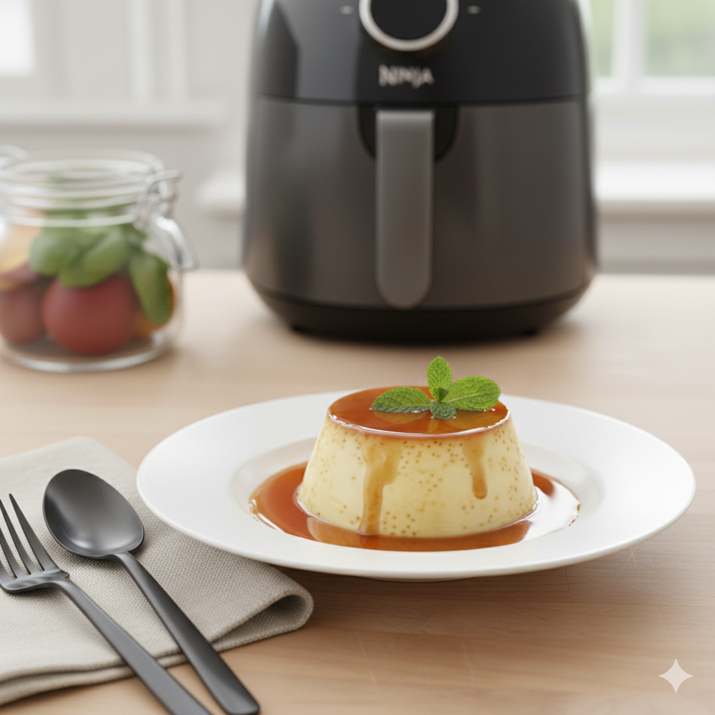 - Dans une casserole, faites fondre 100 g de sucre à feu moyen jusqu’à obtenir un caramel doré. Versez immédiatement le caramel dans des ramequins individuels ou un moule adapté à l’air fryer Ninja. Inclinez les ramequins pour bien répartir le caramel au fond.