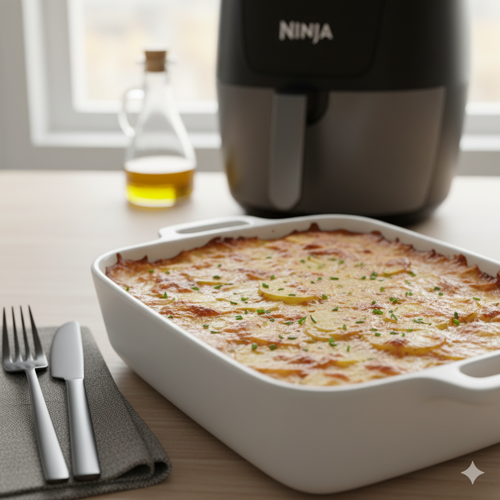 - Placez le plat dans l’air fryer Ninja. Réglez la température à 180°C et faites cuire pendant 25 minutes. Vérifiez la cuisson en piquant les pommes de terre avec la pointe d’un couteau : elles doivent être tendres. Si nécessaire, prolongez la cuisson de 5 minutes.