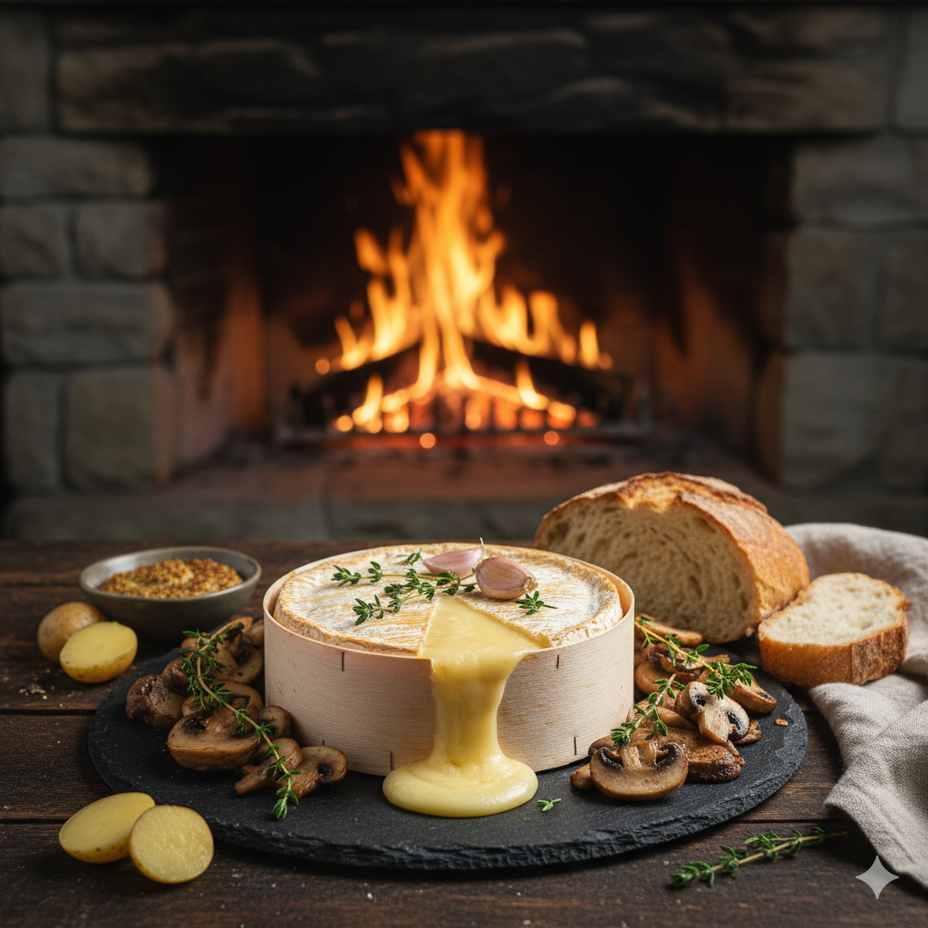 - Retirez le couvercle en bois du mont d’or et creusez légèrement le centre du fromage. Versez le vin blanc dans la cavité et ajoutez l’ail haché. Disposez les branches de thym sur le dessus.