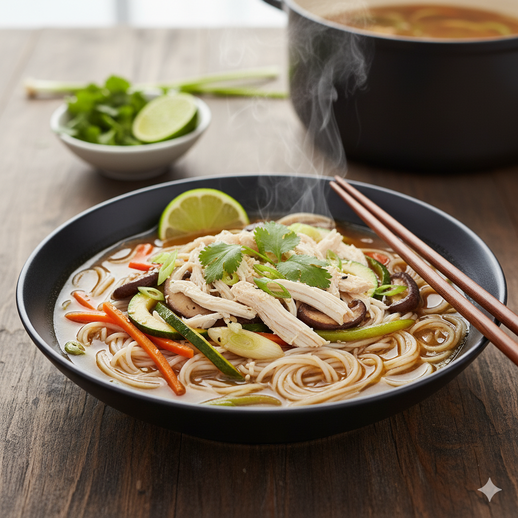 - Répartissez les nouilles de riz dans des bols. Ajoutez le poulet effiloché et versez le bouillon chaud avec les légumes par-dessus. Garnissez de coriandre fraîche et d’un quartier de citron vert, si désiré.