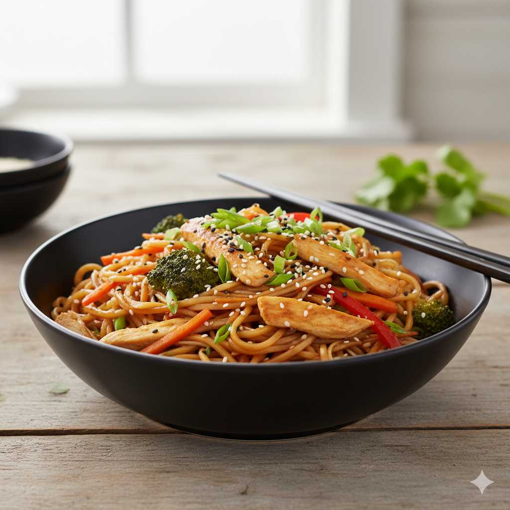 - Remettez le poulet dans le wok avec les légumes. Ajoutez les nouilles de riz égouttées, la sauce d’huître (si utilisée) et le reste de la sauce soja. Mélangez bien pour enrober tous les ingrédients et faites sauter pendant 2 à 3 minutes.