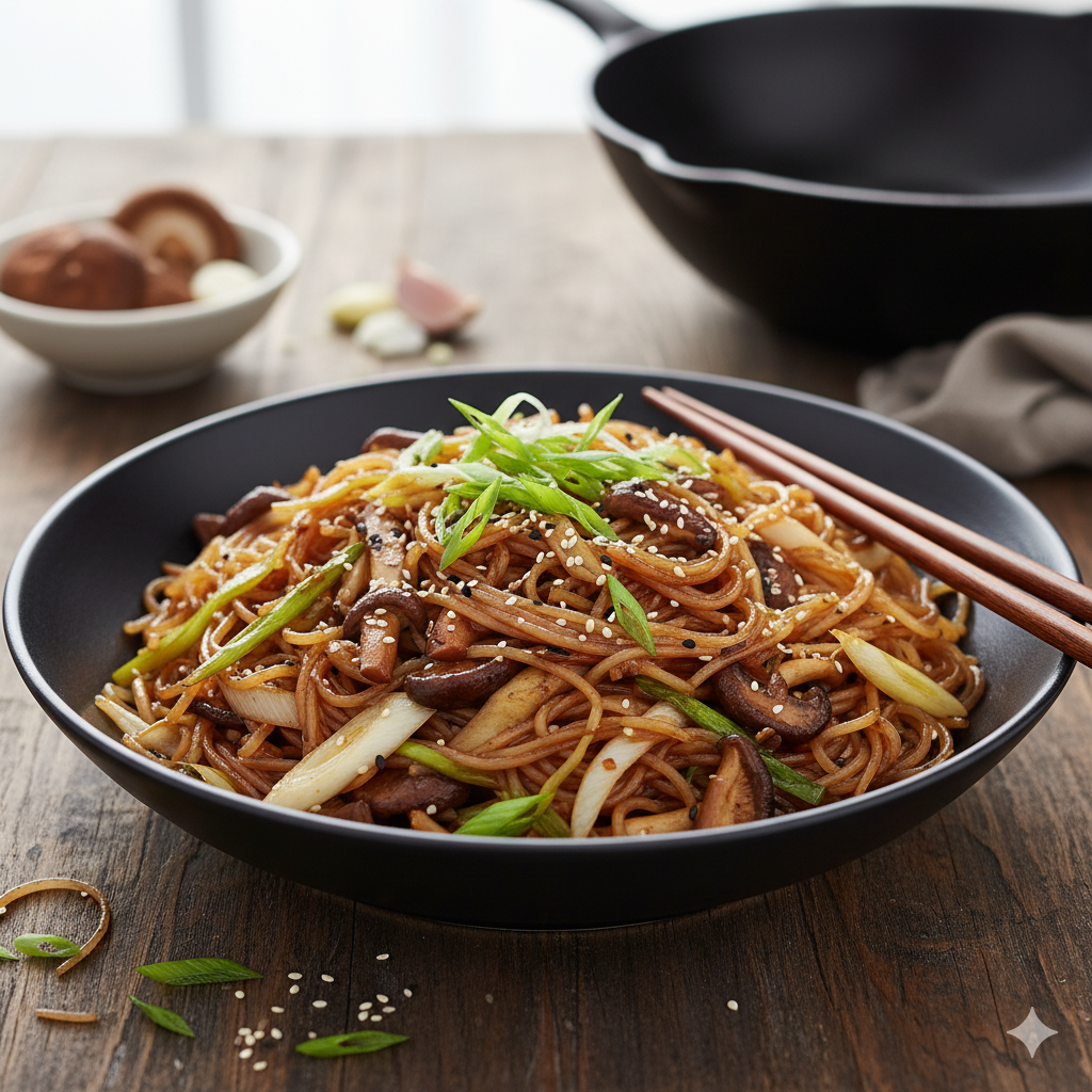 - Servez les nouilles de riz sautées bien chaudes. Garnissez avec des rondelles d’oignon vert et des graines de sésame, si désiré.