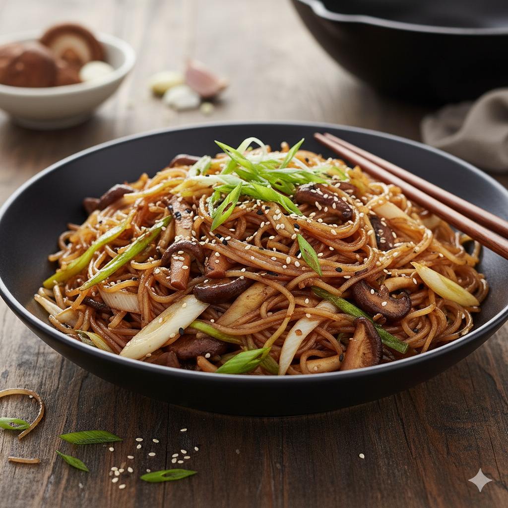 - Ajoutez les nouilles de riz cuites dans la poêle avec les légumes. Versez la sauce teriyaki préparée et mélangez bien pour enrober les nouilles et les légumes. Faites cuire encore 2 à 3 minutes pour que la sauce épaississe légèrement.
