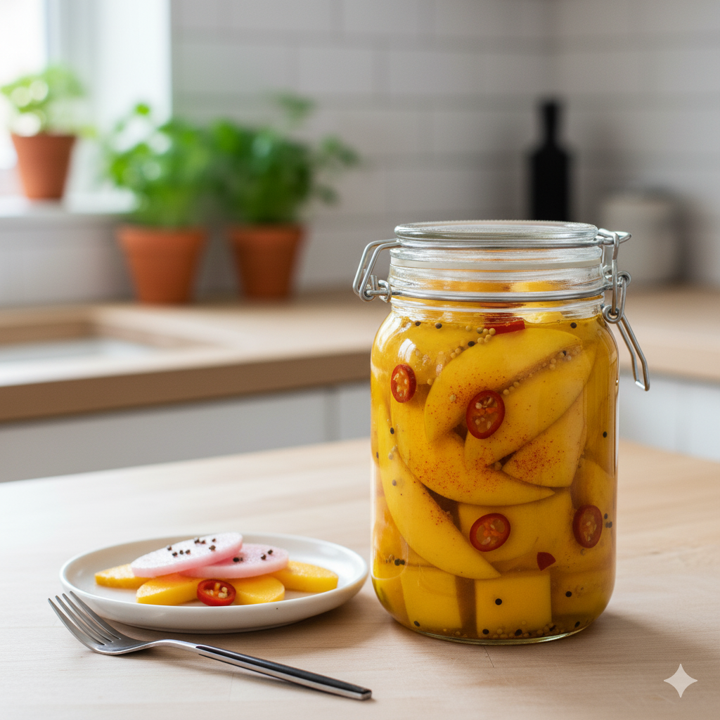 - Dans un bocal stérilisé, disposez les morceaux de mangue, le piment coupé en rondelles et les épices sautées. Versez la marinade chaude par-dessus jusqu’à recouvrir complètement les ingrédients.
