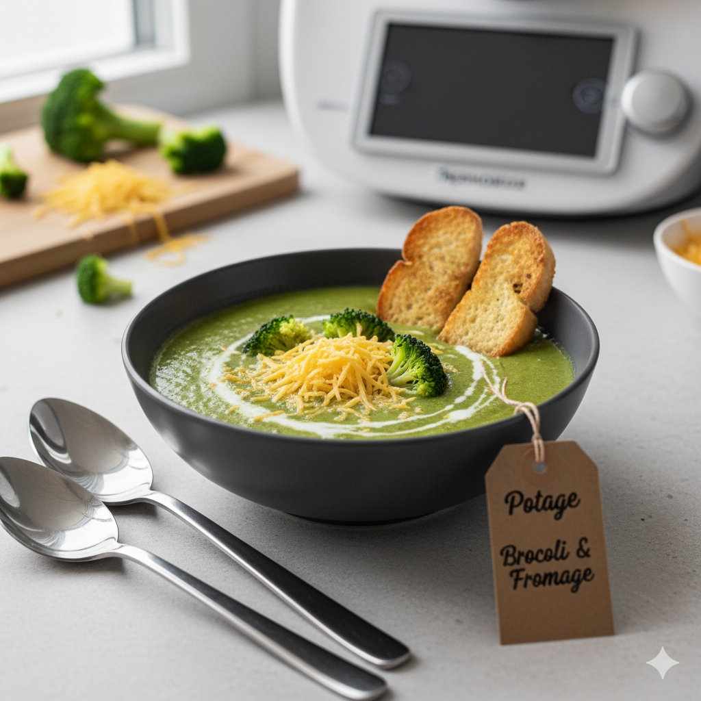 - Dans le bol du Thermomix, ajoutez l’oignon, l’ail, le brocoli, la pomme de terre, l’eau et le cube de bouillon. Programmez 20 minutes à 100°C, vitesse 1.