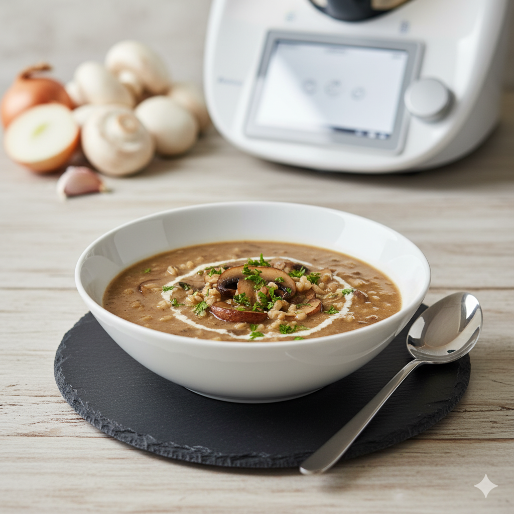 - Ajoutez les champignons émincés et faites cuire 5 minutes à 100°C, vitesse 1, sans le gobelet doseur pour permettre l’évaporation.