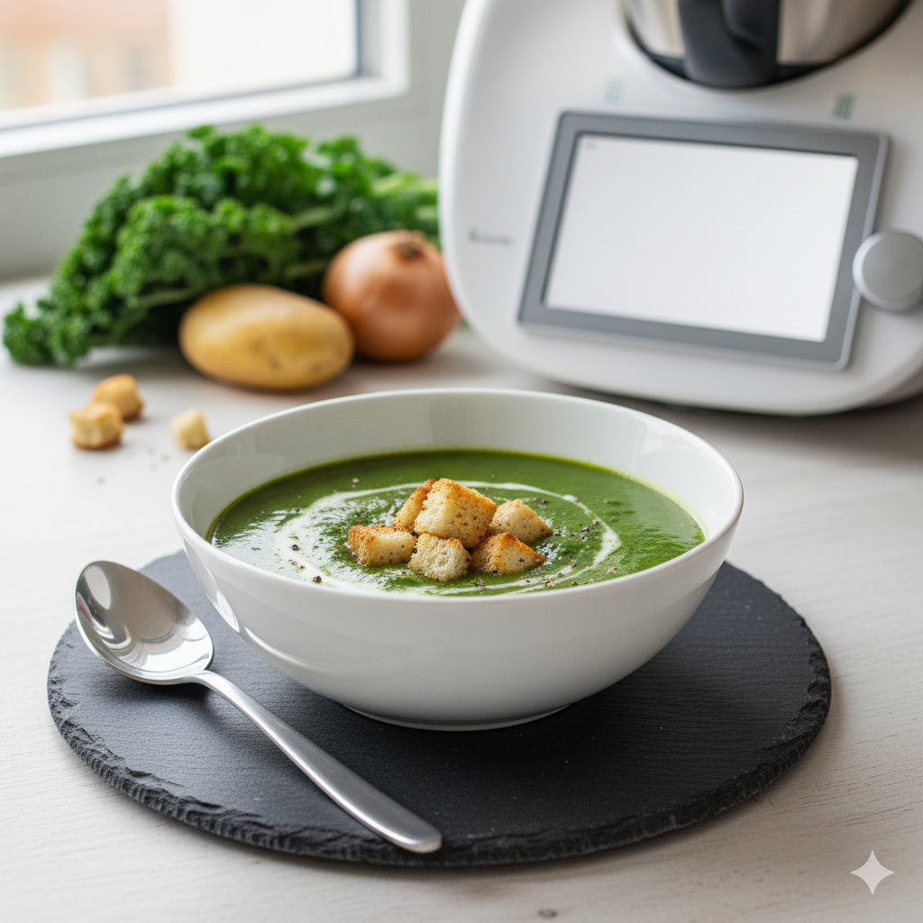 - Ajoutez les pommes de terre, le chou kale, l’eau et le cube de bouillon de légumes. Programmez 20 minutes à 100°C, vitesse 1.