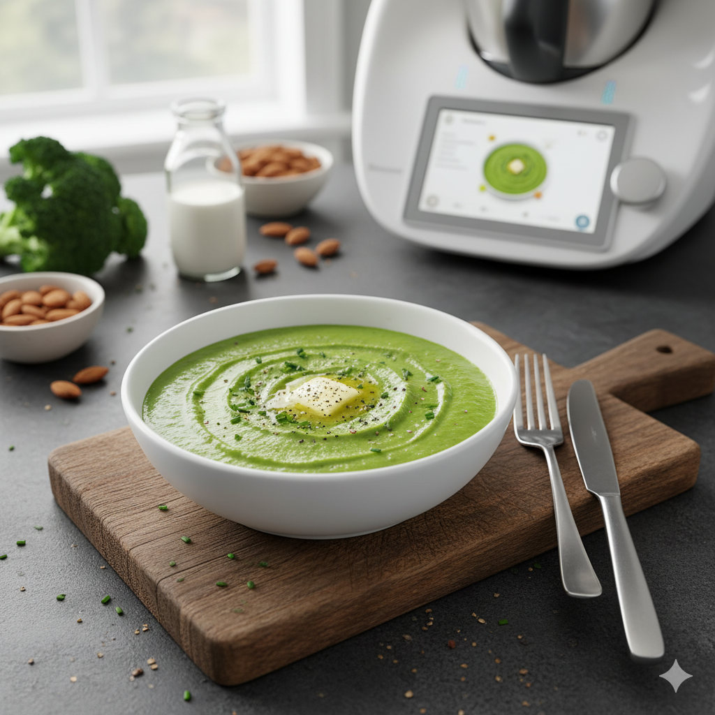 - Une fois le brocoli cuit, videz l’eau du bol du Thermomix. Ajoutez le brocoli, les amandes grillées, le lait, le beurre (ou l’huile d’olive), la noix de muscade, le sel et le poivre. Mixez 1 minute à vitesse 6, puis 30 secondes à vitesse 8 pour obtenir une texture lisse.