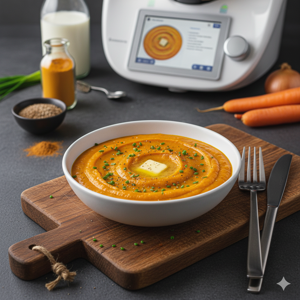 - Dans le bol du Thermomix, ajoutez l’oignon et l’ail. Mixez 5 secondes à vitesse 5. Raclez les parois, ajoutez le beurre ou l’huile d’olive, puis faites revenir 3 minutes à 120°C, vitesse 1.