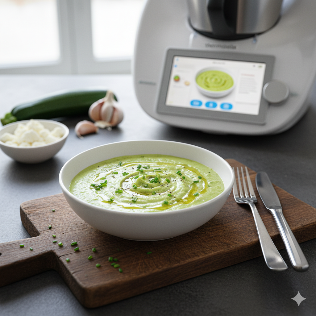 - Placez les rondelles de courgettes et la gousse d’ail dans le bol du Thermomix. Ajoutez une pincée de sel et versez 500 g d’eau. Faites cuire 15 minutes à 100°C, vitesse 1.