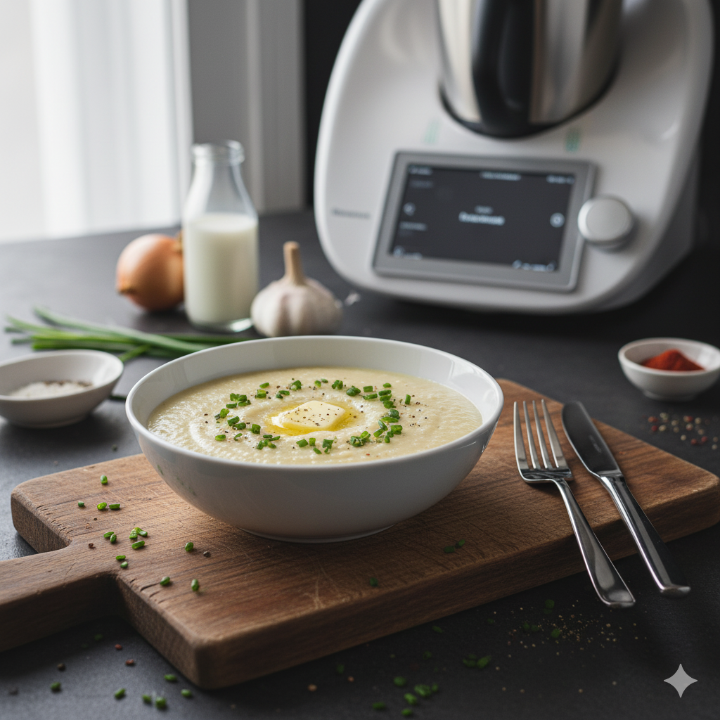 - Mixez le tout 30 secondes à vitesse 6, puis augmentez progressivement jusqu’à vitesse 8 pour obtenir une texture lisse et onctueuse. Ajustez la consistance avec un peu de bouillon si nécessaire.