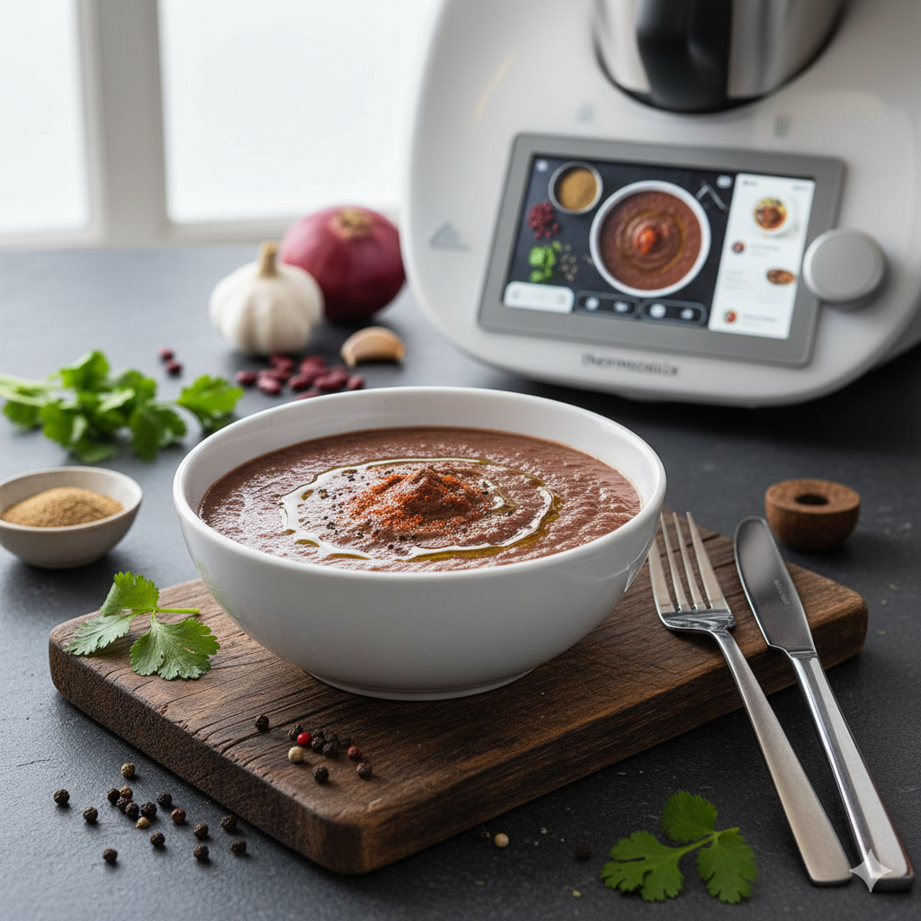 - Mixez la préparation 30 secondes à vitesse 6, puis augmentez progressivement jusqu’à vitesse 8 pour obtenir une texture lisse et onctueuse. Ajustez l’assaisonnement si nécessaire.