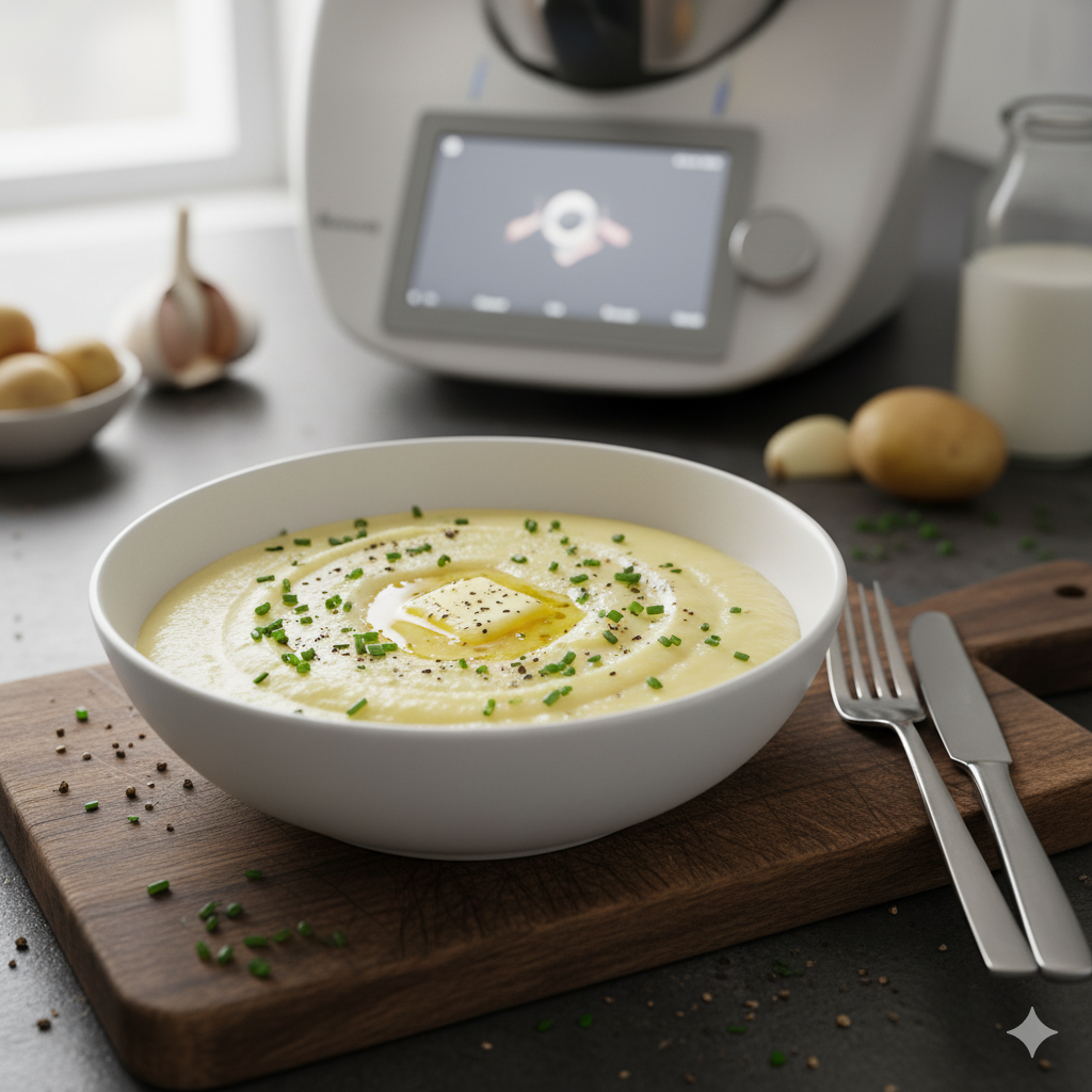 - Une fois les pommes de terre cuites, videz l’eau du bol du Thermomix. Ajoutez les pommes de terre cuites, le lait chaud, le beurre et les gousses d’ail rôti (pressez-les pour extraire la pulpe). Mixez le tout 30 secondes à vitesse 4, en raclant les parois si nécessaire, jusqu’à obtenir une texture lisse et onctueuse.