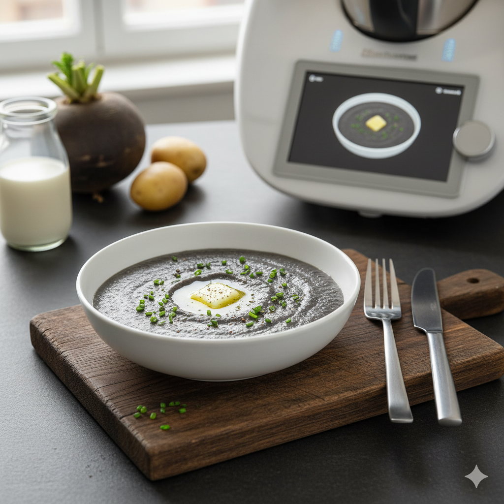 - Mixez le tout 1 minute à vitesse 5, puis augmentez progressivement jusqu’à vitesse 8 pour obtenir une purée lisse et homogène. Ajustez l’assaisonnement si nécessaire.