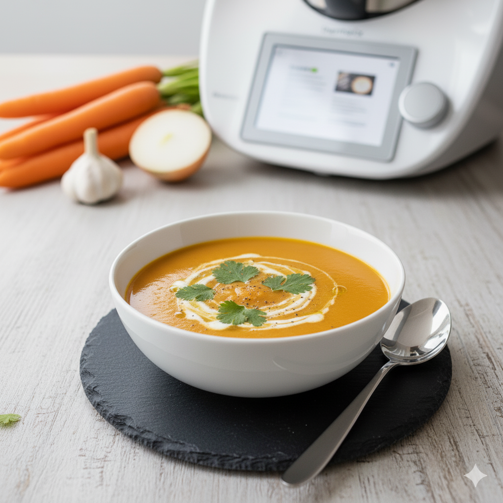 - Une fois la cuisson terminée, mixez la soupe 1 minute en augmentant progressivement la vitesse jusqu’à 10, pour obtenir une texture lisse et onctueuse.