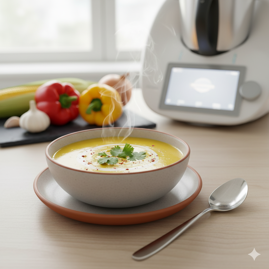 - Ajoutez les morceaux de poivrons et le maïs égoutté. Faites cuire 5 minutes à 100°C, vitesse 1.
