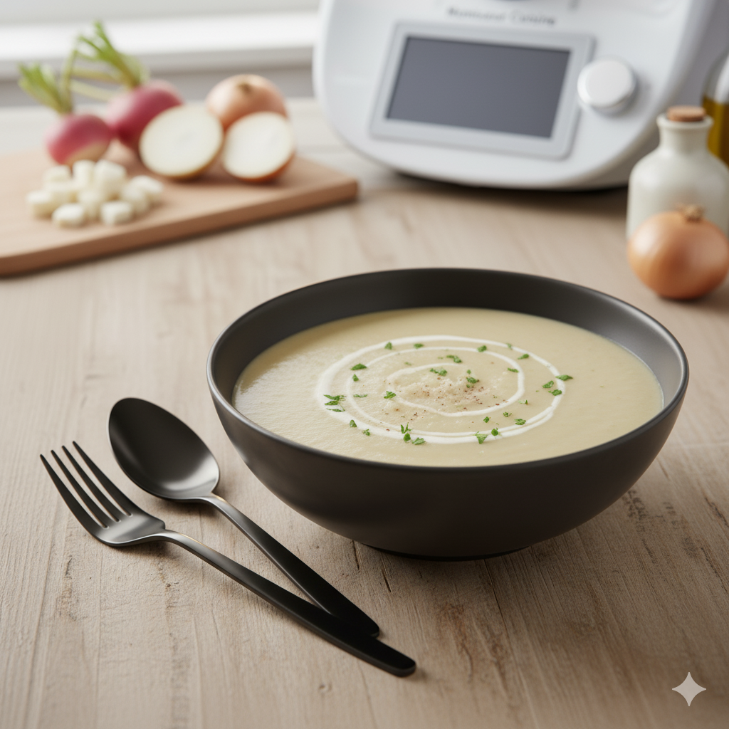 - Une fois la cuisson terminée, mixez la soupe en augmentant progressivement la vitesse jusqu’à atteindre la vitesse 8, pendant environ 1 minute, jusqu’à obtenir une texture lisse et homogène.