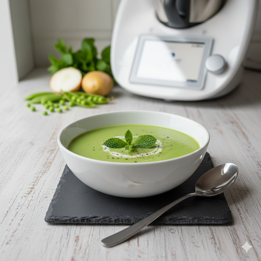 Une soupe de petits pois à la menthe réalisée au Thermomix, parfaite pour une entrée légère et rafraîchissante. Cette recette allie la douceur des petits pois à la fraîcheur de la menthe, tout en étant rapide et facile à préparer.