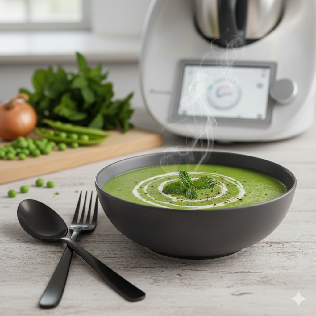 Cette soupe de pois verts et menthe, préparée avec le robot Monsieur Cuisine, est une recette simple, rapide et pleine de fraîcheur. Parfaite pour une entrée légère ou un dîner réconfortant, elle allie la douceur des pois verts à la fraîcheur de la menthe. Une recette idéale pour les amateurs de cuisine saine et savoureuse.