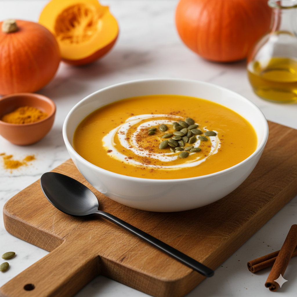 - Servez la soupe chaude, garnie de graines de courge et d’une cuillère de crème fraîche ou de yaourt nature si désiré.
