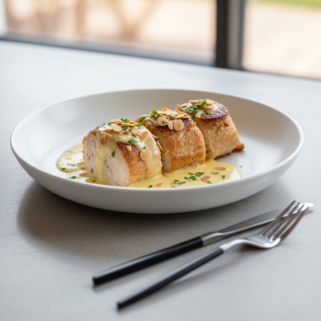 - Retirez délicatement le film alimentaire des ballotines. Disposez-les sur des assiettes chaudes, nappez de sauce citronnée et parsemez des amandes grillées réservées. Servez immédiatement avec un accompagnement de légumes vapeur ou de riz complet.