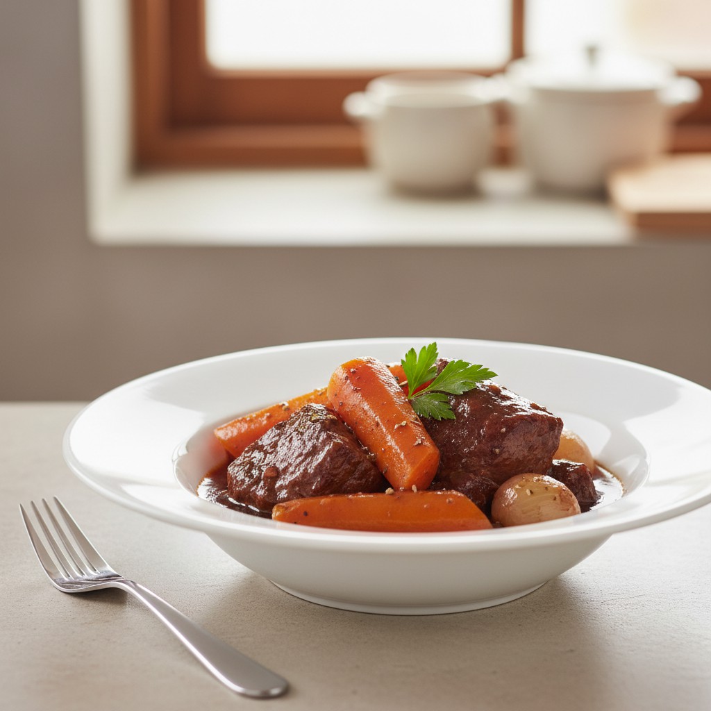 Le bœuf en sauce au vin rouge et carottes est un grand classique de la cuisine française, héritier du bœuf bourguignon. Ce plat mijoté met en valeur la tendreté de la viande, la douceur des carottes et la profondeur aromatique du vin rouge. Il s’agit d’une recette conviviale, idéale pour les repas en famille ou entre amis, qui allie authenticité, équilibre nutritionnel (protéines, fibres, micronutriments) et accessibilité. La cuisson lente permet d’obtenir une sauce onctueuse et parfumée, tout en rendant la viande fondante. Traditionnellement servi avec des pommes de terre vapeur ou une purée, ce plat incarne la générosité et le savoir-faire culinaire français.