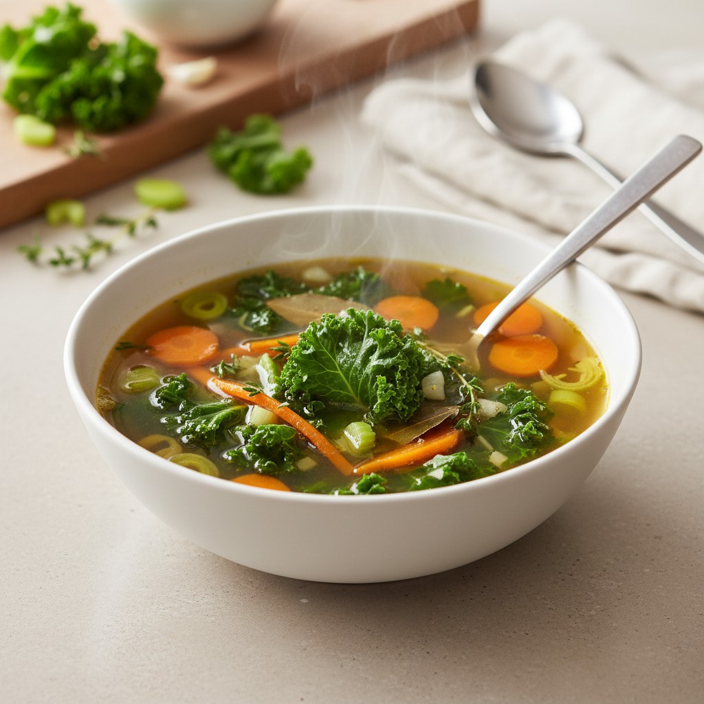 Un bouillon léger et nutritif à base de chou kale et de légumes de saison, parfait pour une entrée réconfortante ou un repas léger. Ce plat met en valeur les bienfaits du chou kale, riche en vitamines et minéraux, tout en étant facile à préparer et adaptable selon les légumes disponibles.