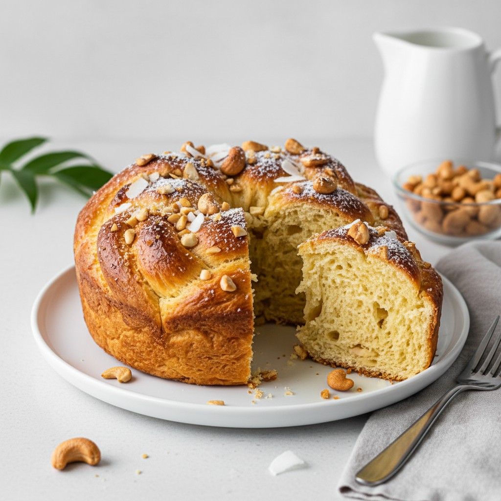 Cette brioche moelleuse marie la douceur du lait de coco à la texture croquante des noix de cajou torréfiées. Inspirée des traditions boulangères françaises et enrichie d’une touche exotique, elle offre un équilibre subtil entre gourmandise et originalité. Parfaite pour le petit-déjeuner ou le goûter, elle se distingue par sa mie filante, son parfum délicat et sa richesse nutritionnelle grâce aux bons lipides des noix de cajou. La recette met l’accent sur la maîtrise de la fermentation et la juste hydratation de la pâte, pour garantir un résultat digne d’une boulangerie artisanale, même à la maison.