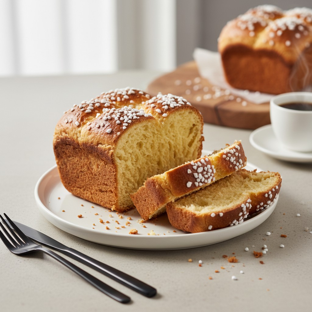 - Préchauffez le four à 170°C (chaleur tournante). Badigeonnez la brioche de lait à l’aide d’un pinceau. Parsemez de sucre perlé si désiré. Enfournez 25 à 30 minutes : la brioche doit être bien dorée et sonner creux en dessous. Si elle colore trop vite, couvrez d’une feuille d’aluminium.