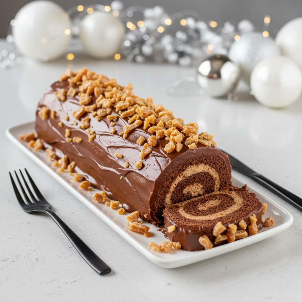 Cette bûche de Noël associe la douceur du chocolat au lait à la gourmandise des éclats de caramel croquants. Une recette festive et accessible, parfaite pour impressionner vos convives tout en respectant les traditions des fêtes de fin d’année.