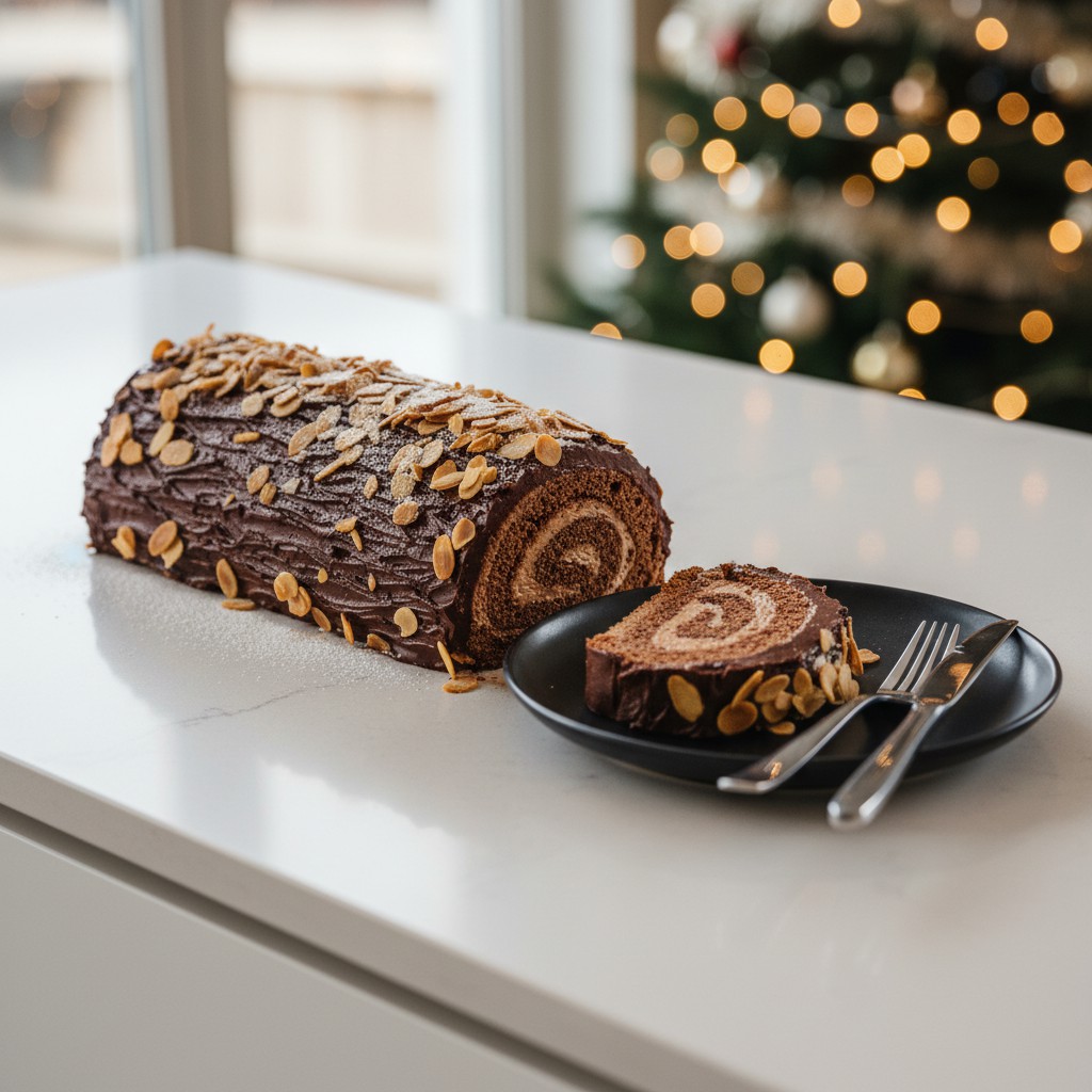 Cette bûche de Noël au chocolat et aux amandes effilées est un dessert festif et gourmand, parfait pour clôturer un repas de fête. Inspirée de la tradition française, elle allie la richesse du chocolat à la délicatesse des amandes pour un équilibre parfait entre douceur et croquant.