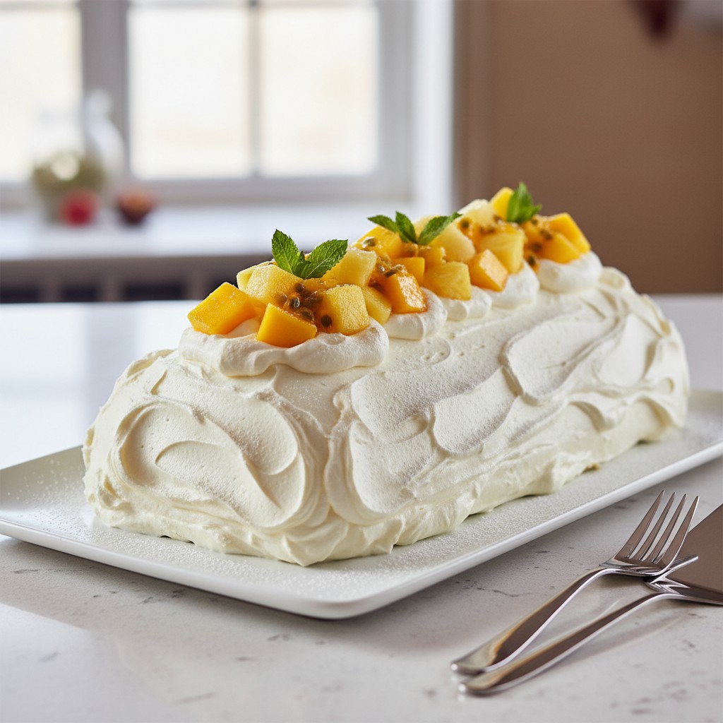 Cette bûche de Noël aux fruits exotiques et crème fouettée est un dessert léger et rafraîchissant, parfait pour conclure un repas festif. Inspirée des saveurs tropicales, elle associe une génoise moelleuse, une crème fouettée aérienne et des fruits exotiques comme la mangue, le fruit de la passion et l’ananas. Une alternative originale et légère aux bûches traditionnelles au chocolat.