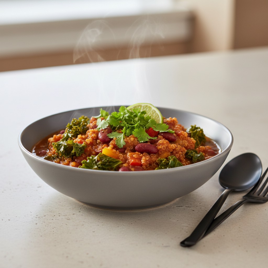 Ce chili végétarien au chou kale et quinoa est une alternative saine et nourrissante au chili traditionnel. Riche en protéines végétales et en fibres, il combine des saveurs épicées et des textures variées pour un repas équilibré et réconfortant. Inspiré des cuisines tex-mex, ce plat est parfait pour les amateurs de cuisine végétarienne ou ceux qui souhaitent réduire leur consommation de viande.