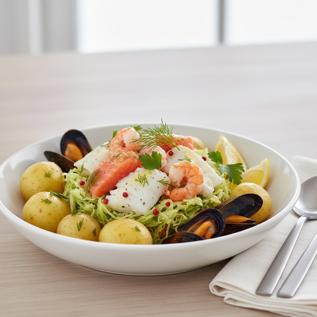 La choucroute de la mer est une variation raffinée et iodée de la traditionnelle choucroute alsacienne. Ici, la choucroute garnie de poissons blancs (cabillaud, lieu, colin…) et de fruits de mer remplace les charcuteries, pour un plat plus léger, digeste et riche en saveurs marines. Cette recette, née sur les côtes atlantiques et en Bretagne, met en valeur la douceur du chou fermenté associée à la délicatesse des poissons pochés. Elle séduit par son équilibre nutritionnel (protéines maigres, fibres, peu de matières grasses) et sa convivialité. Idéale pour un repas festif ou dominical, elle permet de découvrir la choucroute sous un angle moderne, tout en respectant la tradition du chou lactofermenté.