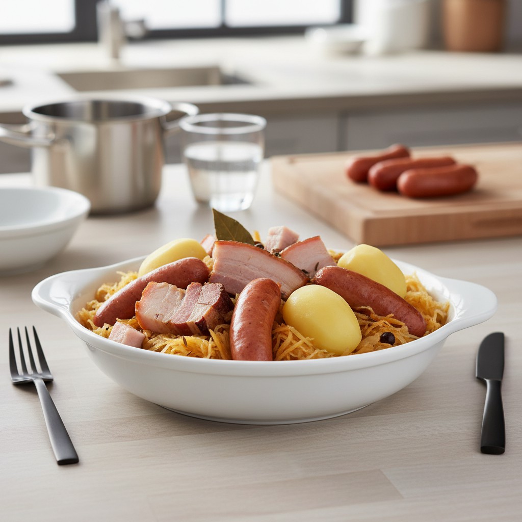- Disposez la choucroute dans un grand plat de service, en répartissant les viandes et les pommes de terre par-dessus. Servez chaud, accompagné de moutarde forte et de pain de campagne.