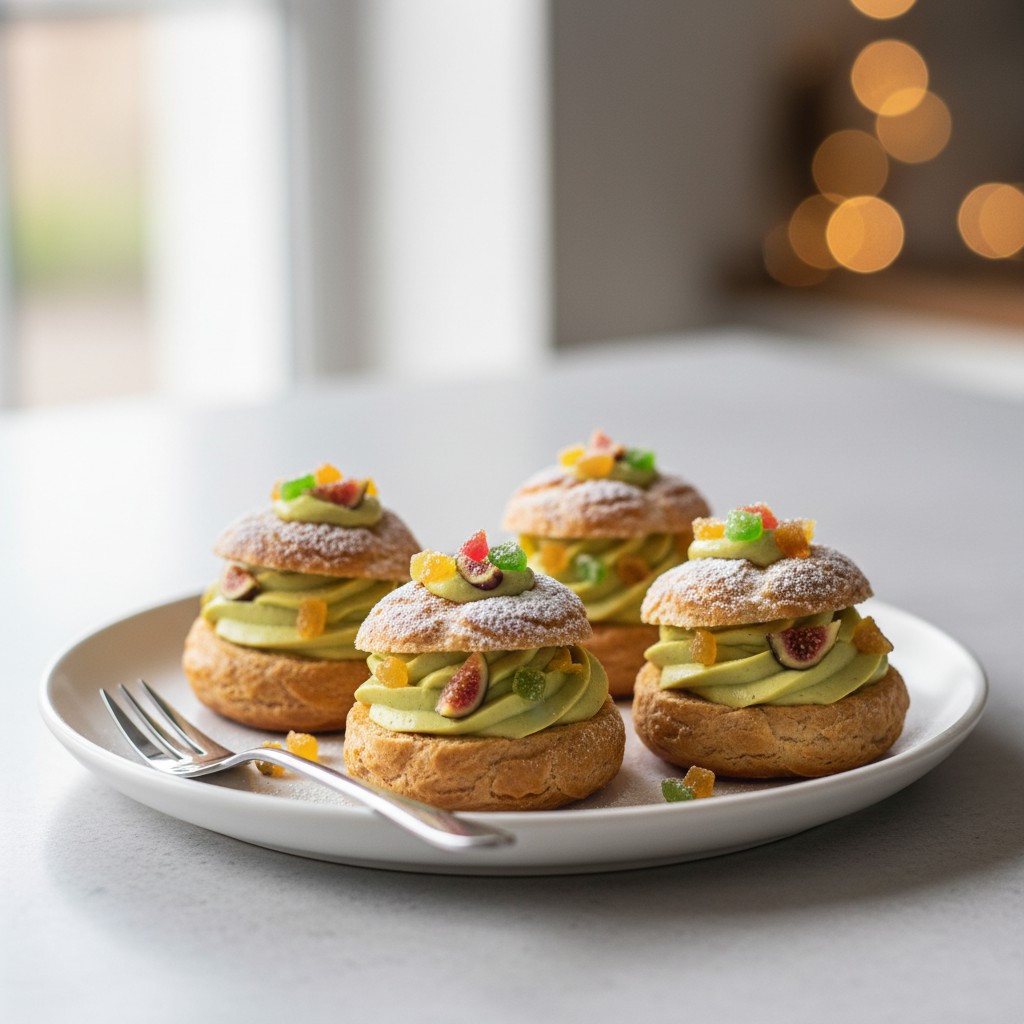 Découvrez une recette de choux légers et croustillants, garnis d’une onctueuse crème pâtissière à la pistache et agrémentés de fruits confits pour une touche sucrée et colorée. Une pâtisserie classique revisitée avec des saveurs gourmandes et équilibrées.