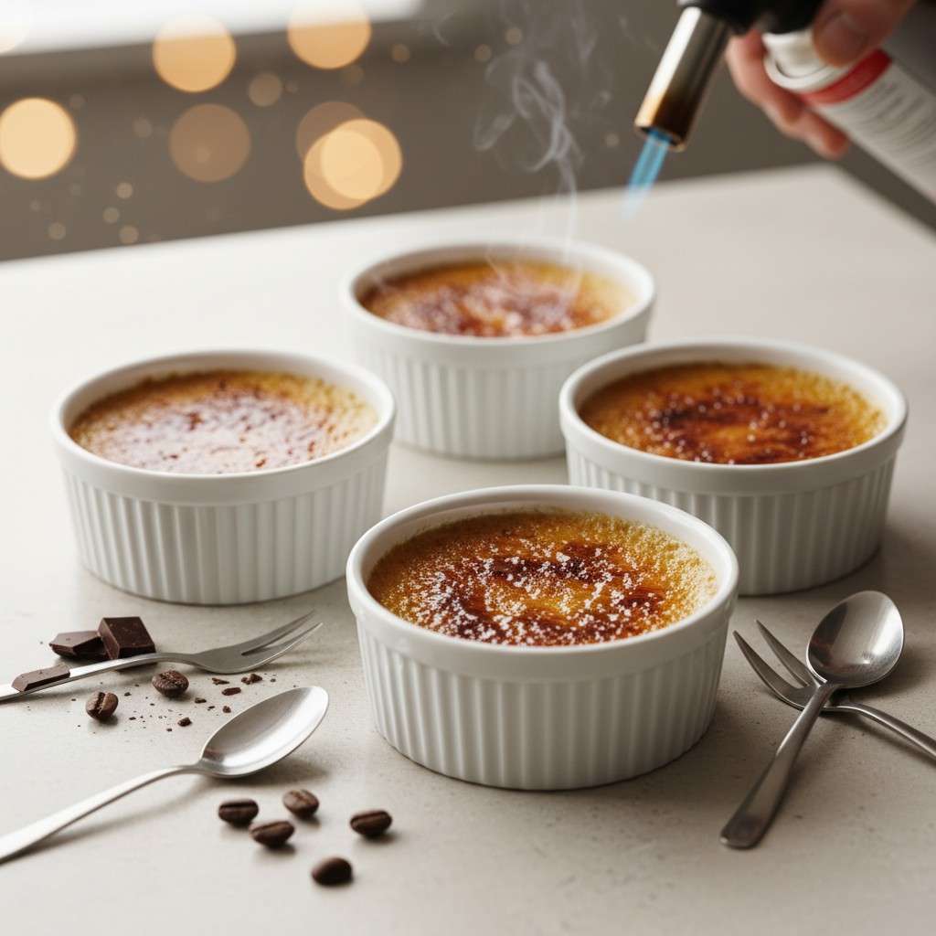 - Juste avant de servir, saupoudrez une fine couche de cassonade sur chaque crème. Utilisez un chalumeau de cuisine pour caraméliser le sucre jusqu’à obtenir une croûte dorée et croustillante. Si vous n’avez pas de chalumeau, passez les ramequins sous le gril du four pendant quelques minutes en surveillant attentivement.