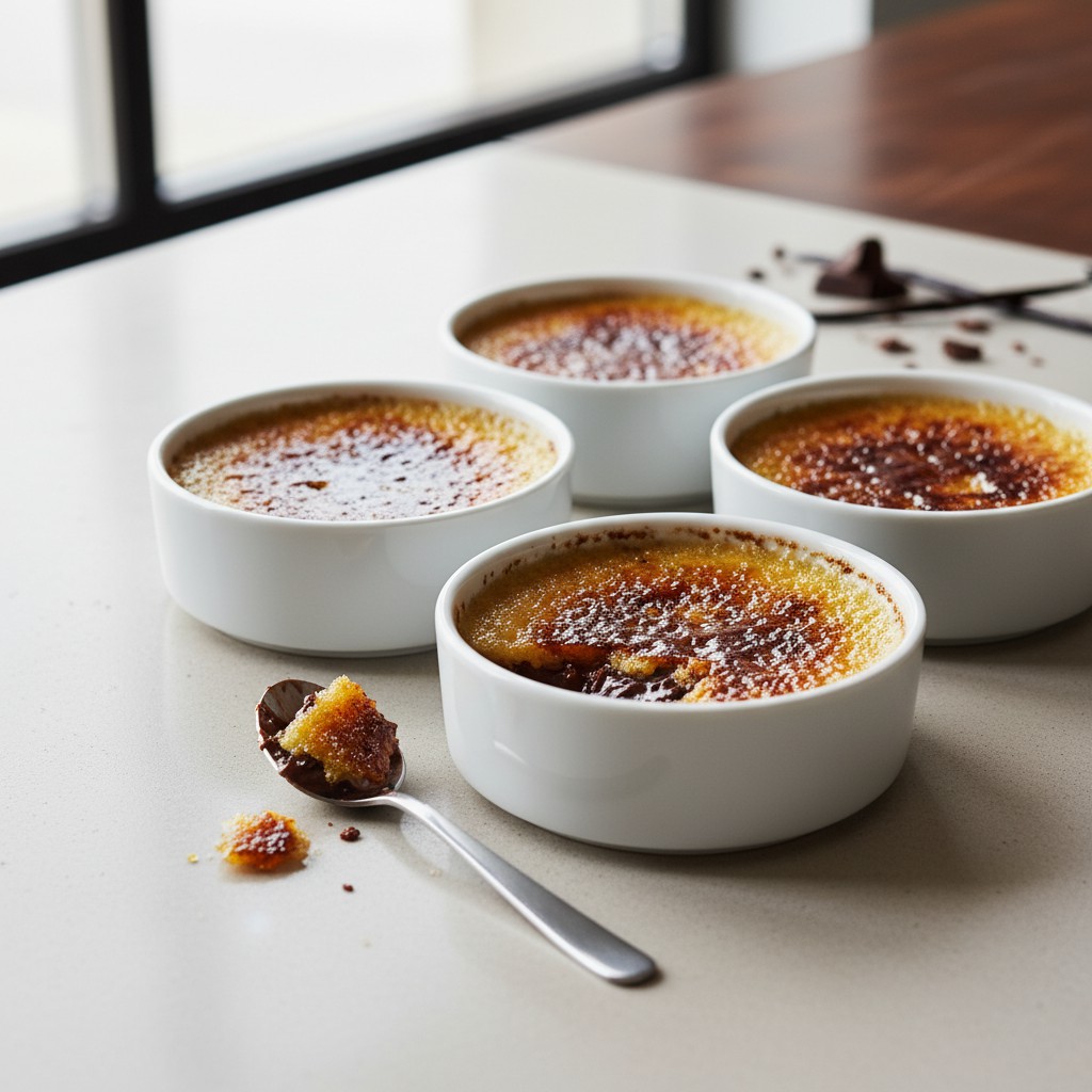 - Juste avant de servir, saupoudrez uniformément chaque crème de cassonade. Caramélisez au chalumeau de cuisine (ou sous le gril du four, porte entrouverte, en surveillant de près) jusqu’à obtenir une fine croûte dorée et craquante. Laissez reposer 2 minutes pour que le caramel durcisse.