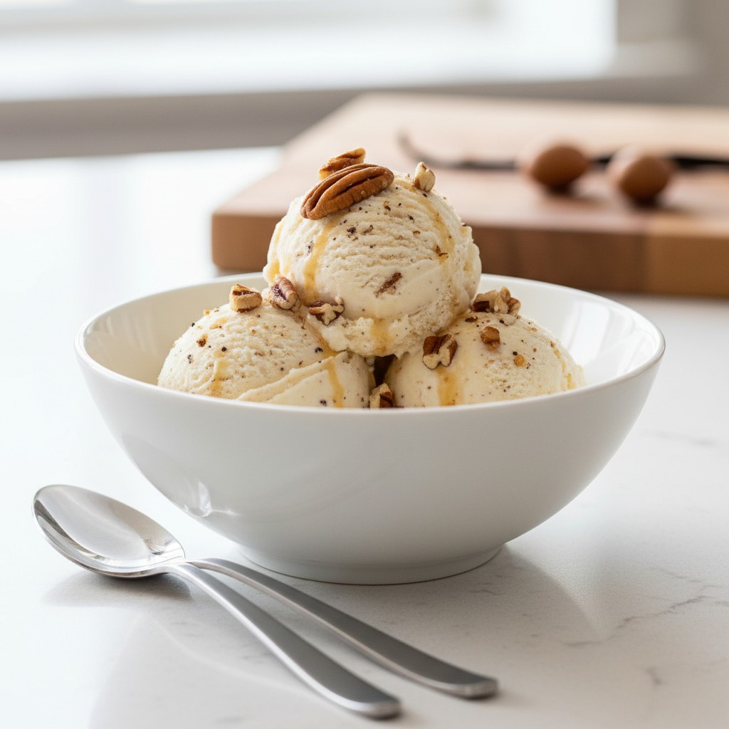 - Versez la préparation bien froide dans une sorbetière. Turbinez selon les instructions de l’appareil (environ 30-40 minutes) jusqu’à obtenir une consistance onctueuse. Ajoutez les noix de pécan concassées 5 minutes avant la fin pour bien les répartir sans les briser.