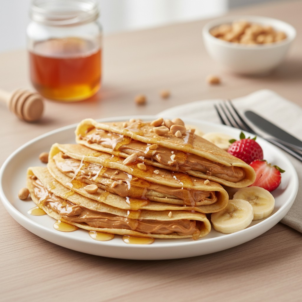 - Étalez une fine couche de beurre de cacahuète sur chaque crêpe encore tiède, puis arrosez de miel liquide selon votre goût. Pliez ou roulez les crêpes avant de servir.