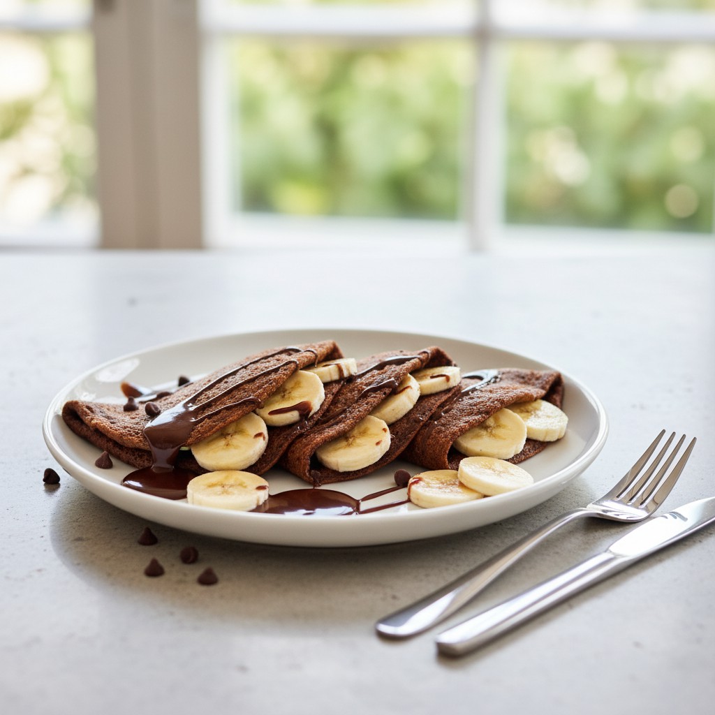 - Déposez quelques rondelles de banane sur chaque crêpe chaude, nappez de sauce chocolat si désiré, puis pliez ou roulez les crêpes. Servez immédiatement pour profiter du contraste chaud-froid et de la texture fondante.
