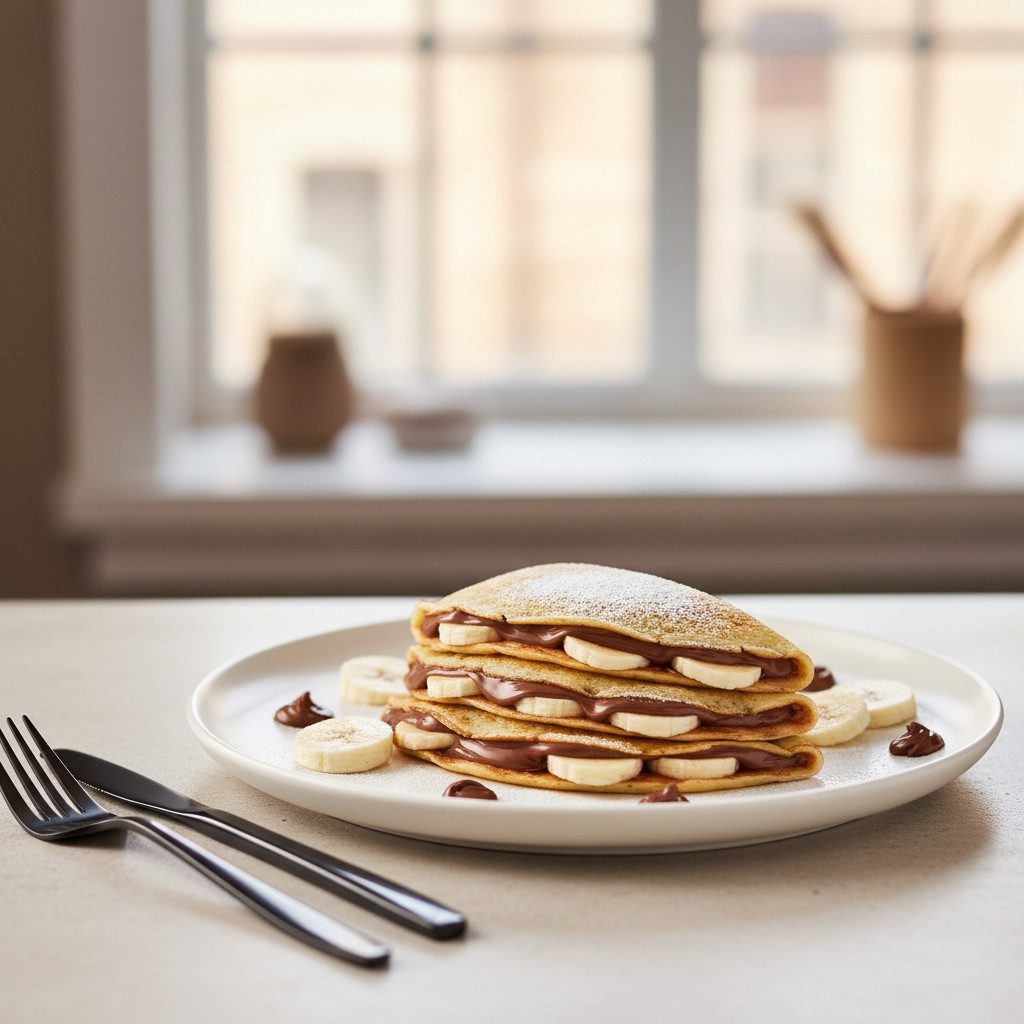 - Déposez une crêpe sur une assiette. Étalez une fine couche de Nutella sur la moitié de la crêpe, disposez des rondelles de banane par-dessus. Pliez la crêpe en deux, puis en triangle ou en rouleau selon la présentation souhaitée. Servez immédiatement pour profiter du contraste chaud-froid.