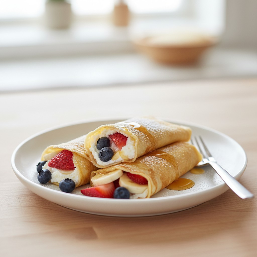 - Étalez une cuillère de garniture à la ricotta sur chaque crêpe. Ajoutez des morceaux de fruits frais sur la ricotta, puis roulez ou pliez la crêpe selon votre préférence.