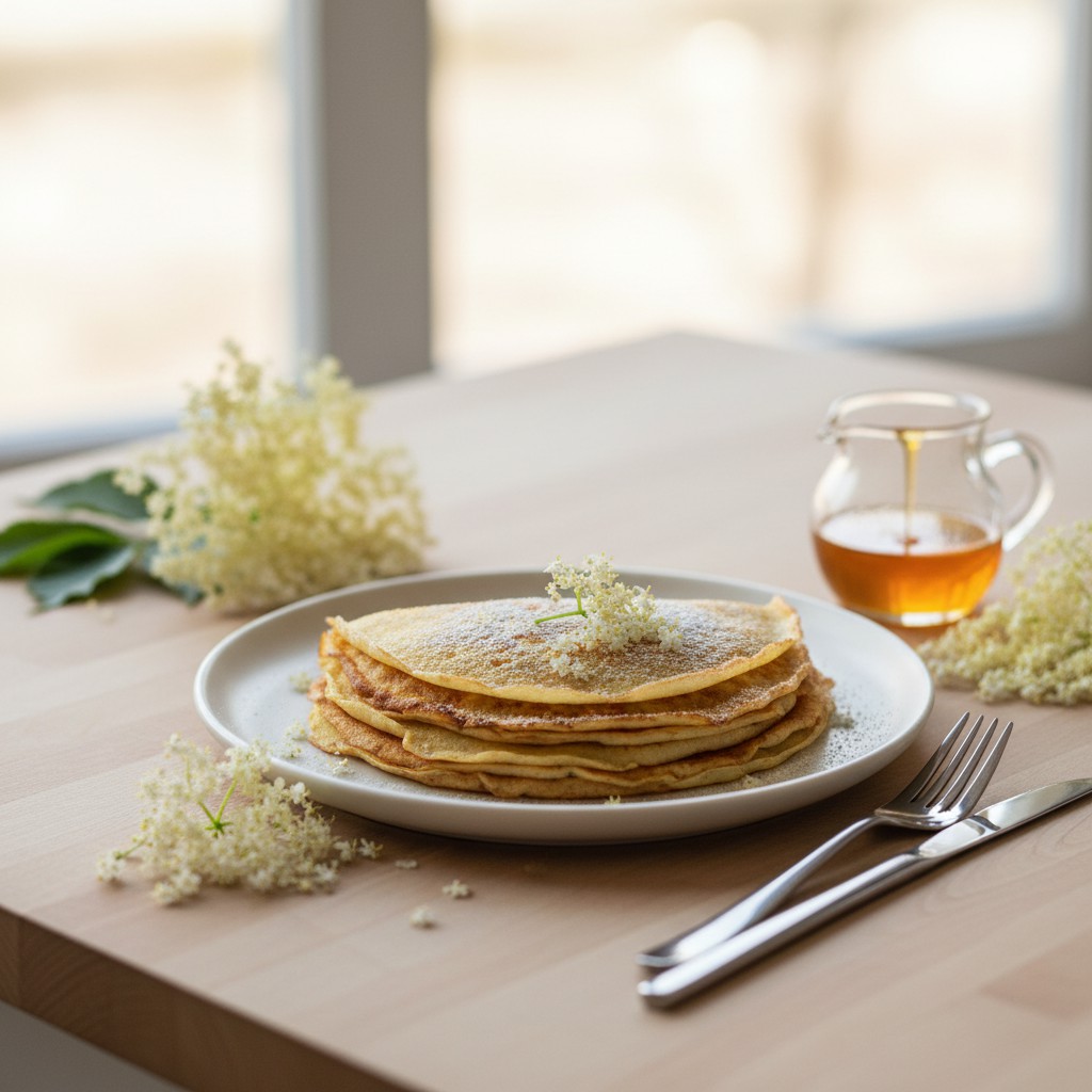 - Servez les crêpes chaudes, accompagnées de sucre, de miel ou d’une confiture légère pour sublimer le goût floral des fleurs de sureau.
