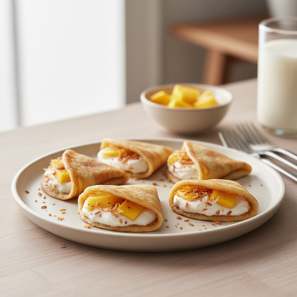 - Déposez une cuillère de crème coco sur chaque crêpe. Ajoutez, si désiré, quelques quartiers de mangue ou de banane. Roulez ou pliez les crêpes. Servez tiède ou à température ambiante.
